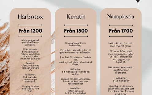 Hos oss kan du också boka behandlingar som lash & browlift, keratin och hårbotox alltid utförda med högsta omsorg.