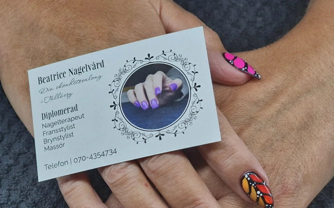 Letar du efter en ny nageltjej? Hej här är jag! Mitt namn är Beatrice och är en utbildad Manikyrist,Nagelterapeut, Frans och Brynstylist via Lillynails och är även utbildad Massör. Håller till gör jag i en salong i vackra Tällberg. Jag ser framemot att du bokar ditt nästa besök hos mig!