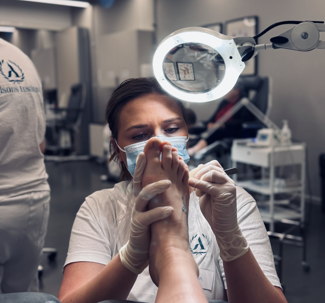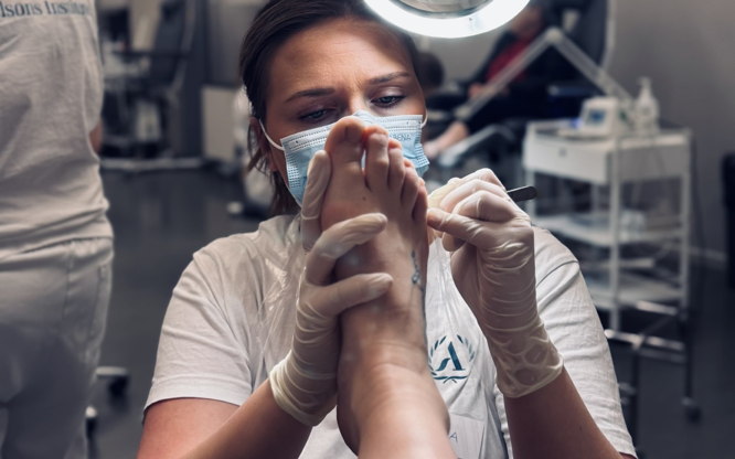 Förebyggande och avslappnande behandling som inleds med uppmjukande fotbad, vård av naglar, borttagning av ev. förhårdnader, vårtor och liktornar.
