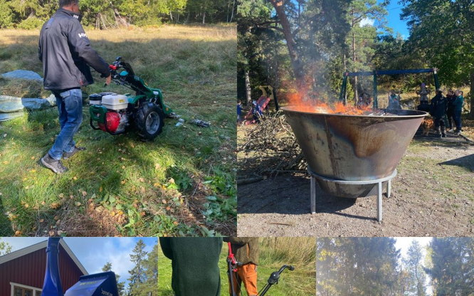 Tvåhjulstraktor Ferrari 338 Powersafe, "Big Bertha", med slåtterbalk . För att slå lite större ängsmarker där traktor inte kommer åt. Med denna utrustning på tvåhjulstraktorn; en gaffelsidräfsa och en mountain press kan du slå, räfsa ihop och göra småbalar av materialet. Kan fraktas på båt eller fyrhjuling med stort släp, kan också transporteras till fots med maskinen igång. Går på XXbensin. Bara traktorn väger 106 kg.