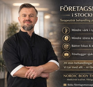 Jag kommer till företaget med komplett professionell utrustning, inklusive ergonomisk massageutrustning, för att skapa en effektiv och avkopplande behandlingsmiljö – mitt i arbetsdagen.