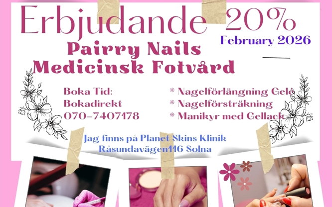 Varm välkommen till Pairry Nails & Medicinsk Fotvård befinner sig i "Planet Skin" lokalen i Råsundavägen116 Solna och tillsammans med dem eftersträva vi en lugn och harmoniskt miljö.(ej drop in) Boka din tid: Kolla Pairry Nails & Medicinsk Fotvård på Bokadirekt! https://www.bokadirekt.se/places/pairry-nails-medicinsk-fotvard-134535 IG:Pairry Nails&Fotvård https://www.instagram.com/pairrynails?igsh=dXVsOWVtNDcwM3F3