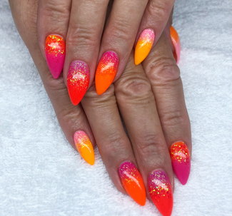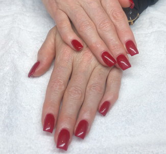 Vi förlänger naglarna med tippar och stärker dom med gele sedan målas dom med gellack.